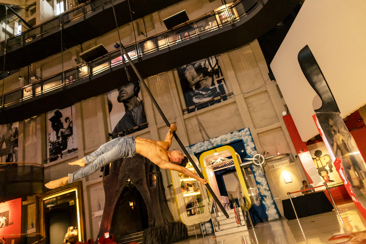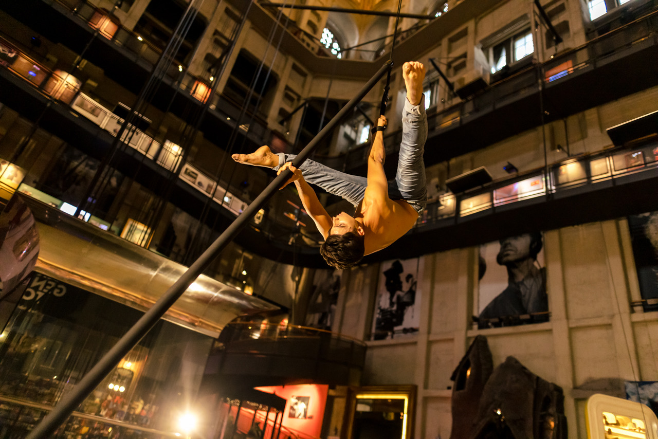 Flying pole act presented within Cirko Vertigo and blucinQue’s show Cinema e Circo, una lunga storia d’amore at the National Museum of Cinema in the historic Mole Antonelliana building in Torino.