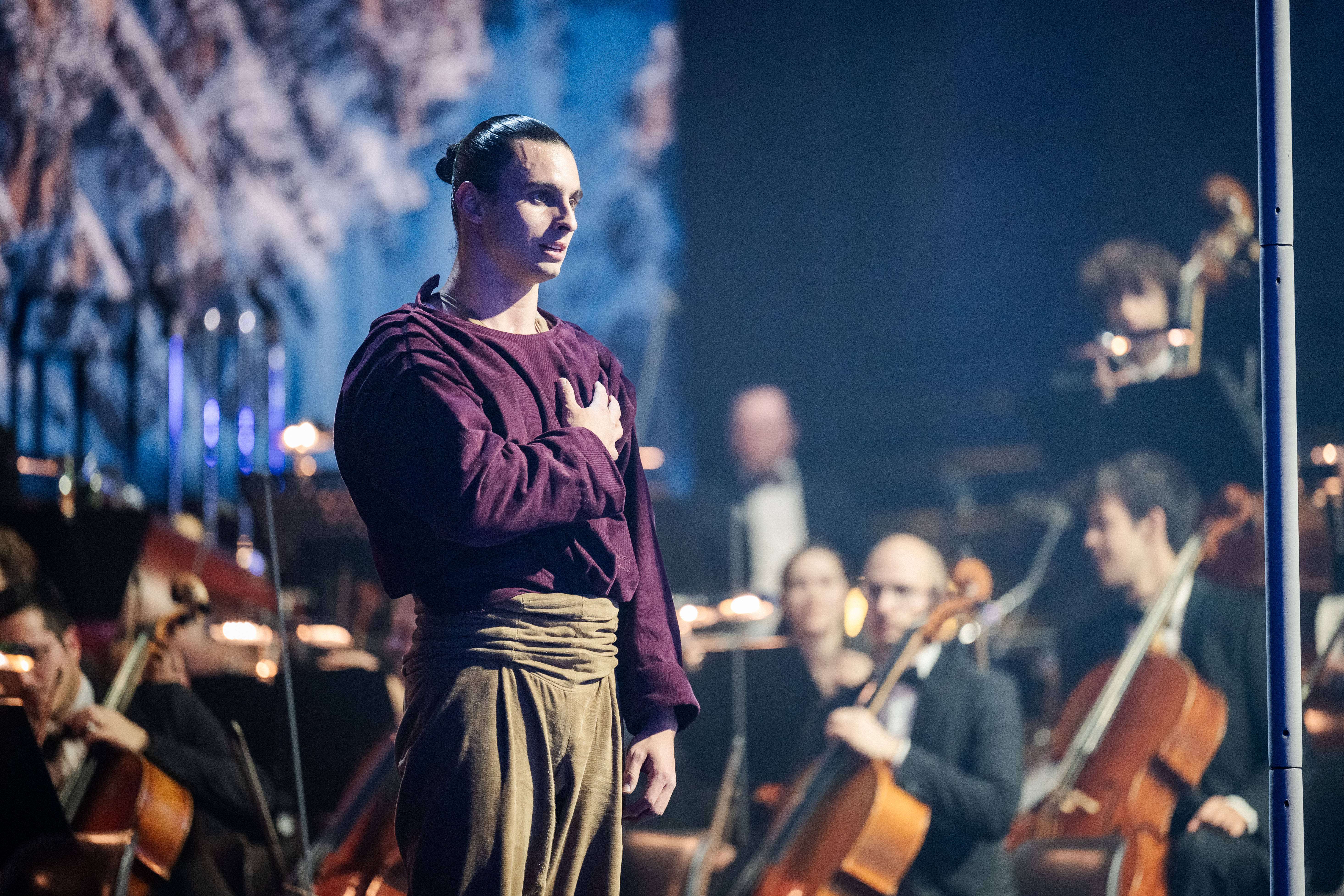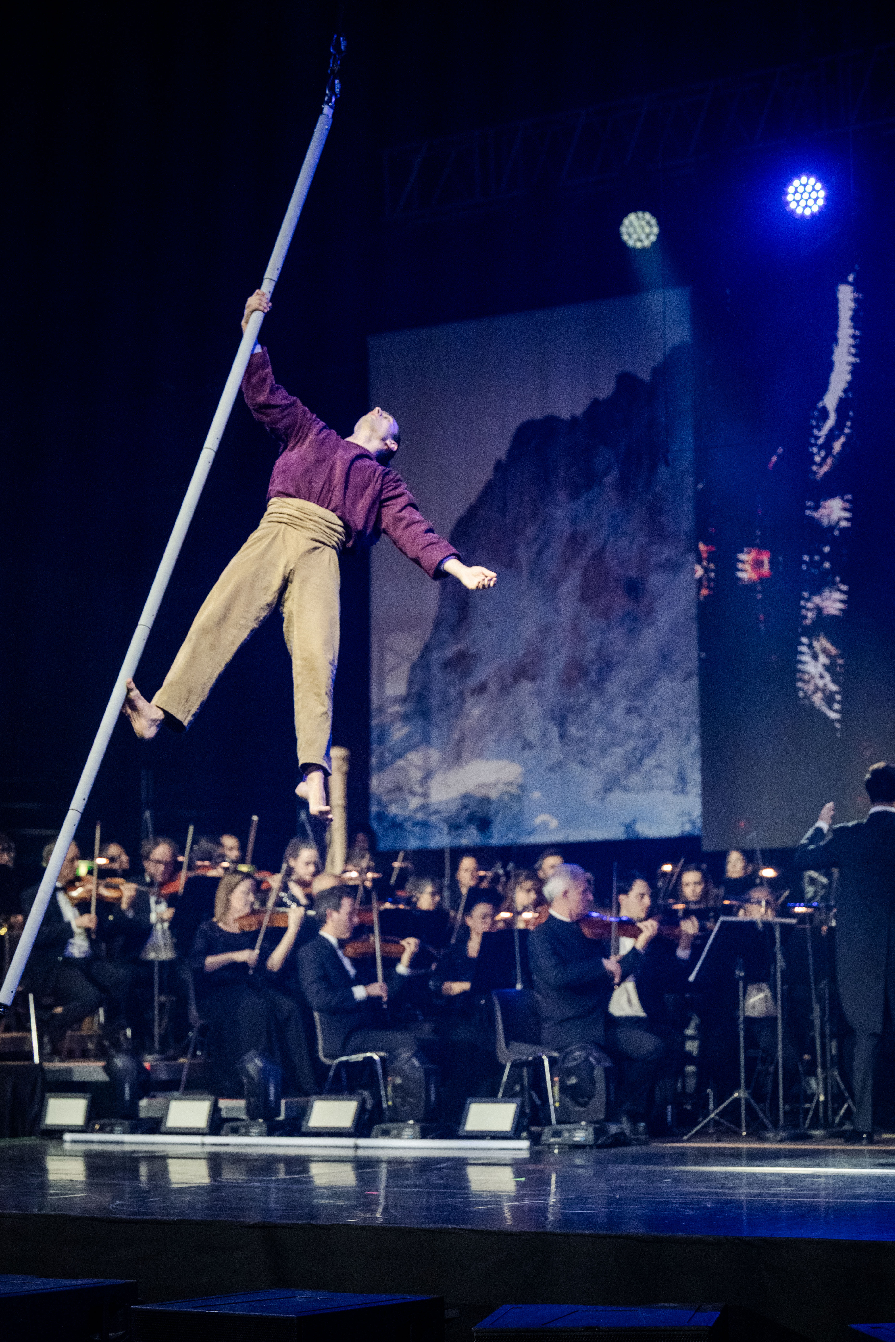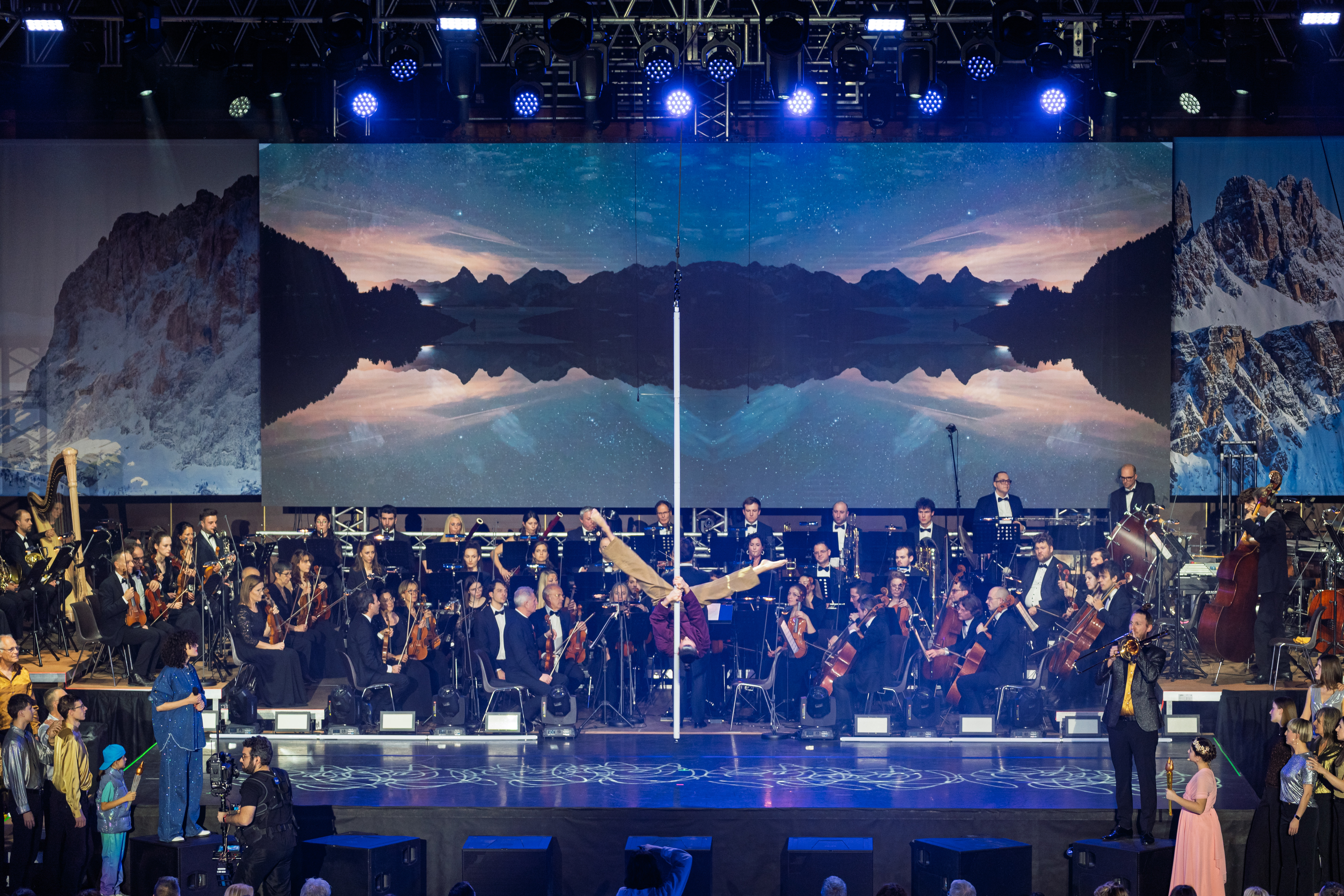Aerial pole act performed to live music by the Südtirol Filarmonica orchestra, trumpeter Peter Steiner, and singer Maria de Val Moling. Presented as the second act of the “On Fire 2026” Winter Games Opening Show Südtirol Alto-Adige at the Stadthalle Bozen.